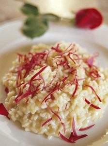 Un buon risotto “romantico” alla rosa si ottiene aggiungendo al brodo del riso un po’ di acqua di rose profumata e i petali (dopo averli lavati con cura), 10 minuti prima del termine della cottura.