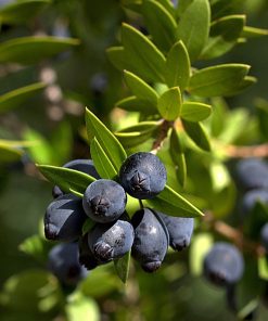 Delle piccole foglie strette coprono questo arbusto durante tutto l’anno. A fine primavera, inizio estate i suoi bei boccioli, di color rosa tenue, esplodono in fiori bianchi. In seguito, da questi fiori si sviluppano bacche blu scuro, simili a piccole olive, che contrastano magnificamente con il fogliame verde lucido.